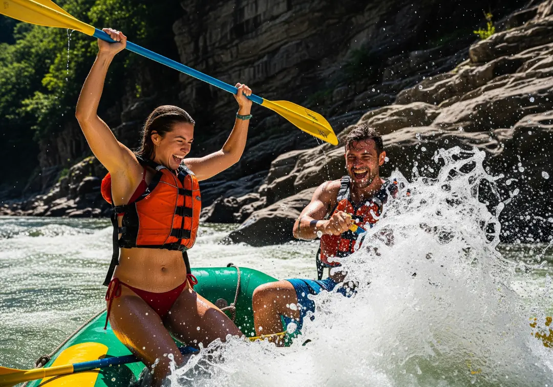 A man and woman in a full-body view, wearing swimwear, celebrate excitedly while whitewater rafting through a rocky river canyon.
