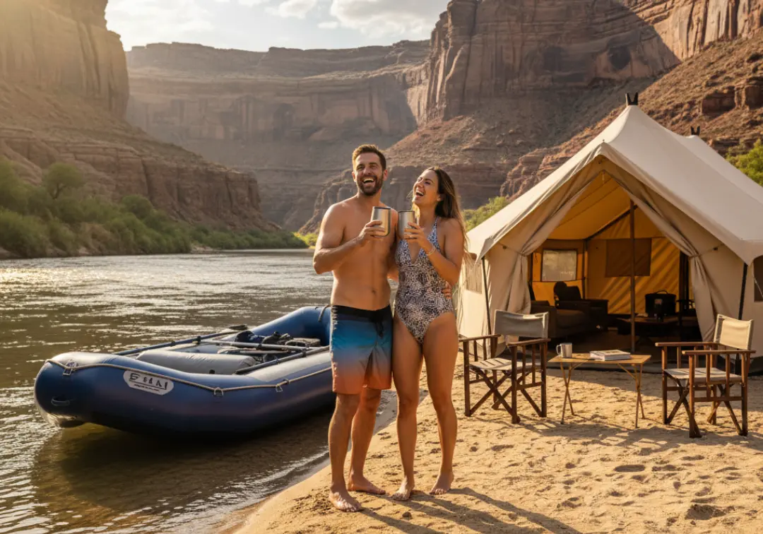 A full-body shot of a fit couple in their late 20s toasting with drinks on a river beach, with a luxury raft and safari-style camp behind them.