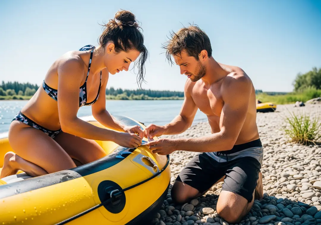 A couple in swimwear performs proactive maintenance on their raft on a sunny riverbank during a trip.