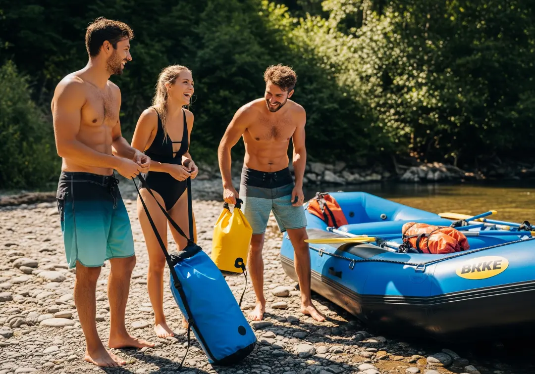 A full-body shot of two men and a woman in swimwear, laughing on a sunny riverbank as they prepare their raft for a whitewater trip.