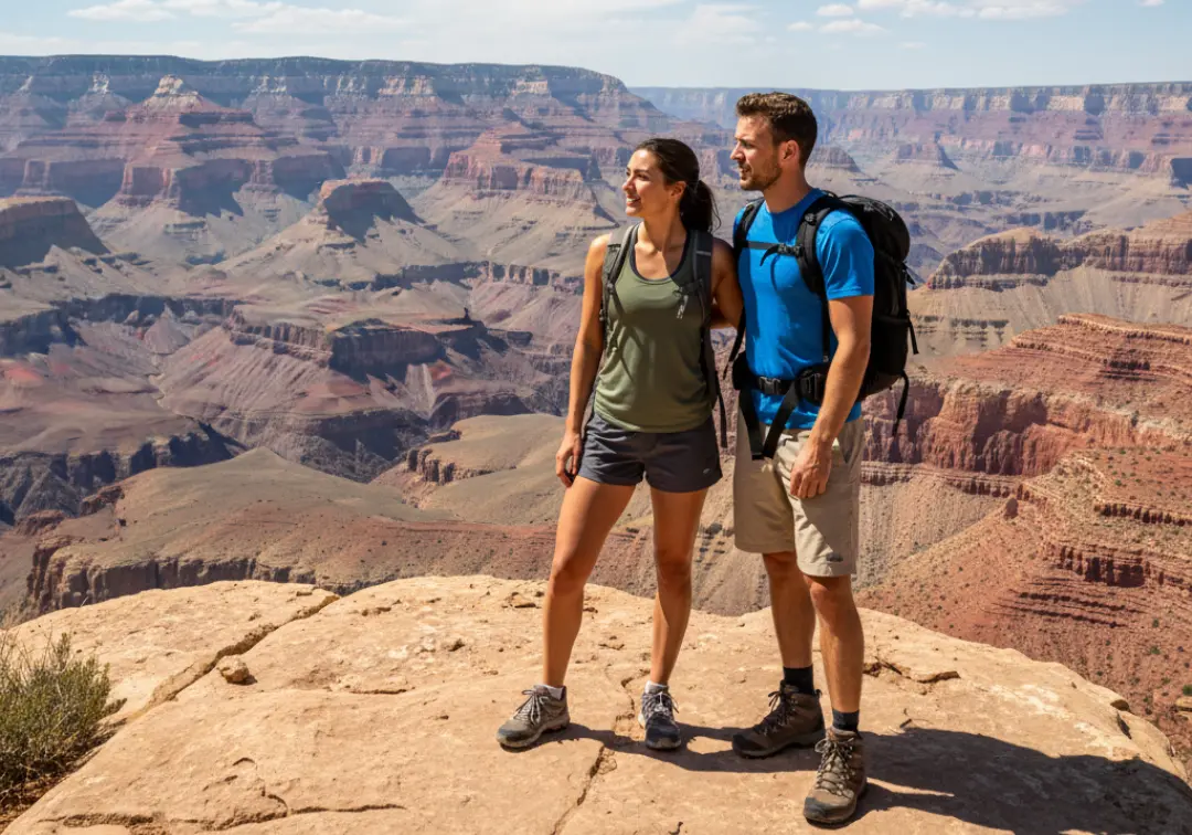 An athletic man and woman in their late 20s, wearing hiking gear and backpacks, stand on a rocky ledge overlooking a massive desert canyon, training for a rafting trip.